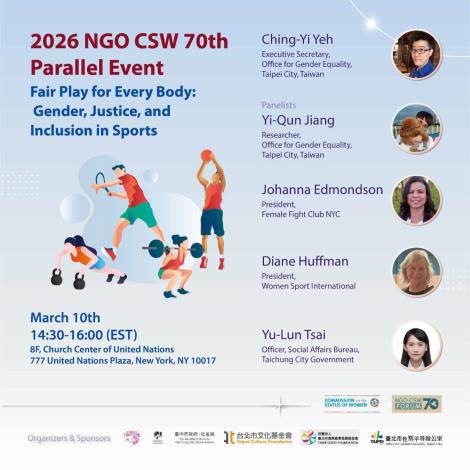 發稿單位:性別平等辦公室發稿時間:115年3月11日聯 絡 人:性別平等辦公室執行秘書葉靜宜聯絡電話:1999轉2320,0963-309-722 2026年3月9日至3月20日,第70屆聯合國婦女地位委員會(CSW & NGO CSW 70)於紐約盛大舉行。本屆優先主題聚焦「確保並強化所有女性與女孩獲得司法正義的機會」,並回顧女性全面參與公共生活與消除暴力之進展。臺北市政府持續深耕國際參與,率團走進全球人權與性別平權對話的核心場域,以城市治理實踐向世界發聲。臺北市主辦重點論壇:人人都能公平參與3月10日,臺北市性別平等辦公室主辦重點論壇—「人人都能公平參與:運動中的性別、正義與共融(Fair Play for Every Body:Gender, Justice, and Inclusion in Sports)」—從運動場域切入,呼應本屆回顧主題,探討女性與多元性別者在公共生活中的平等參與及賦權。論壇除了分享臺北推動性別友善場館、檢視相關賽事規範與提升女性決策參與的經驗外,也邀請國際組織代表交流,包括長期倡議女性體育權益的「國際女性運動組織」 (Women Sport International),以及以格鬥運動推動女性培力的「女性格鬥推廣基金會」( Female Fight Club Foundation)。江逸羣研究員表示,「運動亦是培養自信、重塑身體敘事與建立支持網絡的重要力量。女性於運動領域仍面臨資源分配不均、傳統性別刻板印象及性別暴力等挑戰」。然而,臺北市政府近年持續推動許多亮點政策,包含開發U-sport App推廣全民運動、從共融泳池試辦計畫到營造運動中心性別友善空間,以及女子籃球推廣活動提升女性規律運動等,積極打造兼具安全、尊重與多元的運動環境。運動是公共參與的縮影。論壇中也強調,唯有從制度與文化雙軌並進,拆除隱形門檻,才能讓不同身體自在進場、長久參與。這正是回顧主題所揭示的核心精神—讓女性在公共領域中被看見、被納入、被尊重。與公民社會同行:從制度改革到數位暴力防治的跨國對話此外,在本屆NGO CSW 70期間,臺北市政府亦與民間團體並肩參與兩場重要論壇,展現市府與公民社會攜手推動性別正義的力量。於3月9日舉辦的「從立法到實踐:臺北落實性別正義的經驗(From Legislation to Implementation: Practicing Gender Justice in Taipei)」論壇,由台灣彩虹平權大平台主辦,聚焦公私協力如何將性別平權從倡議轉化為制度實踐,探討立法推動、政策落實與跨部門合作的城市經驗。臺北市分享運用公私協力模式推動各項LGBTQ+等性別友善措施之經驗,回應本屆優先主題。隨後於3月11日,由台灣同志諮詢熱線主辦的「亞洲 LGBTQ+ 社群面臨的性別暴力與數位暴力(Gender-Based and Digital Violence Against LGBTQ+ Communities in Asia)」論壇,則將視角延伸至數位時代下的跨國挑戰。論壇網路性別暴力、數位性剝削與社群攻擊對LGBTQ+社群的衝擊,並從亞洲多國經驗中尋求制度與社群並進的回應策略。臺北市分享城市在性別暴力防治體系中的實務經驗與反思,並與國際夥伴共同思考,在科技快速變遷之下,如何讓法律保障與服務體系跟上現實的速度。兩場論壇不僅展現臺北市與公民團體間緊密合作的基礎,也凸顯在全球化與數位化浪潮中,性別正義必須透過跨部門、跨城市與跨國界的協力行動,才能真正落實於制度與日常生活之中。讓性別平等成為城市日常風景從運動場到公共決策場域,從法律制度到數位空間,臺北市以具體政策回應全球性別議題,展現城市在國際舞台上的責任與能力。展望未來,臺北市將持續深化性別主流化,強化法律保障與公共決策參與,並透過數據治理與國際交流,建構更具包容性的城市,將性別平等落實為日常的城市風景。