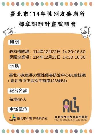 想讓您的單位一起打造更友善、安心、尊重多元的如廁空間嗎?臺北市性別平等辦公室推出「性別友善廁所標章認證計畫」,鼓勵本市各單位申請性別友善廁所認證。申請期間自即日起至115年1月23日止,歡迎本市各單位踴躍申請 (申請資訊詳見性平辦官網https://reurl.cc/pK6nAx)為了讓各單位進一步瞭解申請方式及指標內容,我們將辦理兩場說明會,讓大家帶回第一手資訊!說明會資訊及報名連結:政府機關場:114年12月22日(一)14:30報名點此 https://reurl.cc/MM8Gov民團企業場:114年12月23日(二)14:30報名點此 https://reurl.cc/GGAlYW地點:臺北市家庭暴力暨性侵害防治中心 B1 盧梭廳(台北市中正區延平南路123號 B1)每場名額 60 名(如報名踴躍,將再視情況加開線上場次) 講者: 臺北市性別平等辦公室執行秘書 葉靜宜